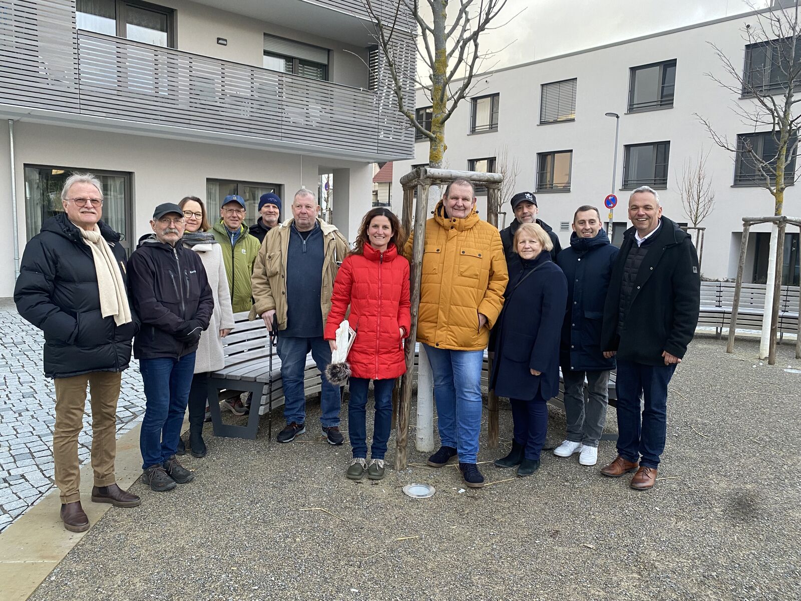 Durch die Lage mitten im Ort seien die Menschen direkt ins Ortsleben integriert, merkte Gemeinderätin Anna Ohnweiler an. Das Pflaster auf dem Platz ist darüberhinaus durch speziell angepasste Pflastersteine rollator- und rollstuhlgerecht, Bänke unter Bäumen laden zum Verweilen ein. Auch die futuristisch anmutenden Buswartehäuschen würden dem Platz einen besonderen Charme verleihen, betonte Ortsvorsteher Bruno Schmid. Carl Staud erkundigte sich nach dem Waldkindergarten und der dortigen Unterbringungsmöglichkeiten. Dieser werde sehr gut angenommen und es komme eine zweite Gruppe dazu, berichtete Bruno Schmid. Bei ungünstigem Wetter können sich Kinder und Erzieher im gut ausgestatteten Bauwagen aufhalten. Schmid führte die Gäste durch das abgeschlossene Baugebiet Reesengarten. Die direkt daneben gelegene Grundschule kann im Bedarfsfall ebenso wie der Kindergarten erweitert werden. Nur der Pausenhof lag Schmid am Herzen: „Dieser muss vergrößert werden, damit die Kinder sich in der Pause richtig austoben können.“