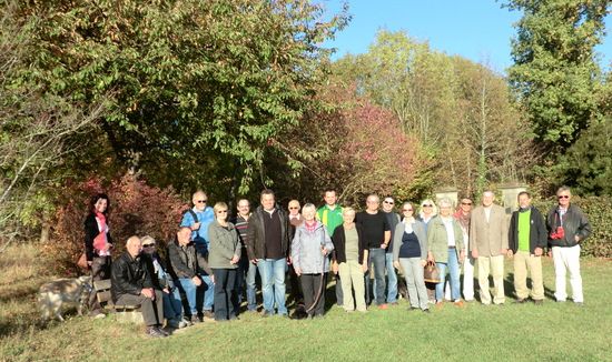 Gruppe im Naturdenkmal Lehnd auf Vollmaringer GemarkungNagold. „Eine Landschaft wie im Märchen“, mit diesen Worten brachte Heike Birgit Damke, SPD-Ortsvereinvorsitzende und Ortschaftsrätin von Vollmaringen, bei der Herbstwanderung der SPD-Nagold die Eindrücke und Gefühle der Mitwanderer auf den Punkt. Denn bei strahlendem Sonnenschein konnte die Gemeinschaft unter der fachlichen Leitung von Wolfgang Herrling am vergangenen Sonntag die landschaftlichen Schönheiten des Oberen Gäu zwischen Hochdorf und Vollmaringen entdecken.